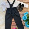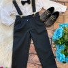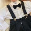 Conjunto composto por: Camisa social manga longa na cor branca, gravata borboleta e calça com suspensório na cor preta. Demais peças ou acessórios, não inclusos.