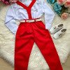 Este conjunto social infantil é a escolha perfeita para deixar os pequenos elegantes e confortáveis em eventos como casamentos, batizados, aniversários, formaturas e cerimônias em geral. Com um visual sofisticado, ele é ideal para quem busca estilo com praticidade. Detalhes do Produto: Camisa social branca de manga longa, confeccionada em microfibra 100% poliéster, com toque macio, caimento leve, clássica e confortável Calça vermelha confeccionada em twill colorido 100% poliester, com corte reto e caimento sofisticado. Acompanha gravata borboleta vermelha , suspensório vermelho com regulagem e cinto ajustável branco com fivela metálica. Itens Inclusos:Camisa SocialCalçaGravata borboletaSuspensórioCinto Calçado não incluso – vendido separadamente. Disponivel em nosso site na categoria calçados meninosAs tonalidades das peças podem variar de acordo com as configurações de tela do seu dispositivo.Para garantir o ajuste ideal, consulte sempre a nossa tabela de medidas antes de finalizar a compra. As medidas podem apresentar 2cm de variações conforme o lote de fabricação.
