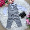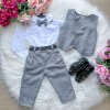 Conjunto composto por: Camisa social na cor Branca manga longa, gravata borboleta cinza, calça na cor cinza, colete de alfaiataria cinza e cinto. Demais peças ou acessórios, não inclusos. Calçados Vendindos Separadamente NOIVINHOPAGEMBATIZADO * LEMBRANDO QUE PODERA HAVER VARIAÇÃO DE TONALIDADE DO PRODUTO DEPENDENDO DA TELA DO SEU DISPOSITIVO