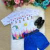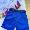 Conjunto composto por: Camisa social na cor Branca com Desenhos, Gravata Borboleta Azu,Shorts na cor Azul e Cinto na Cor Preta