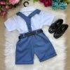 Conjunto composto por: Camisa social na cor Branca manga curta, gravata AZUL, short na cor AZUL, suspensorioAZUL e cinto.