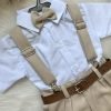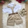 Conjunto composto por: Camisa social na cor Branca manga curta, gravata BEGE, short na cor BEGE, suspensorio BEGE e cinto.