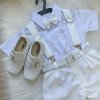 Este conjunto social infantil é a escolha perfeita para deixar os pequenos elegantes e confortáveis em eventos como casamentos, batizados, aniversários, formaturas e cerimônias em geral. Com um visual sofisticado, ele é ideal para quem busca estilo com praticidade. Detalhes do Produto: Camisa social branca de manga curta, confeccionada em microfibra 100% poliéster, com toque macio e caimento leve. Short preto em twill 100% poliéster, com acabamento moderno na barra dobrada. Acompanha gravata borboleta branco, suspensório branco com regulagem e cinto ajustável branco com fivela metálica. Itens Inclusos:CamisaShortGravata borboletaSuspensórioCinto Calçado não incluso – vendido separadamente. Disponivel em nosso site na categoria calçados meninosAs tonalidades das peças podem variar de acordo com as configurações de tela do seu dispositivo.Para garantir o ajuste ideal, consulte sempre a nossa tabela de medidas antes de finalizar a compra. As medidas podem apresentar pequenas variações conforme o lote de fabricação.