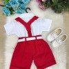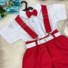 Este conjunto social infantil é a escolha perfeita para deixar os pequenos elegantes e confortáveis em eventos como casamentos, batizados, aniversários, formaturas e cerimônias em geral. Com um visual sofisticado, ele é ideal para quem busca estilo com praticidade. Detalhes do Produto: Camisa social branca de manga curta, confeccionada em microfibra 100% poliéster, com toque macio e caimento leve. Short preto em twill 100% poliéster, com acabamento moderno na barra dobrada. Acompanha gravata borboleta vermelha, suspensório vermelho com regulagem e cinto ajustável branco com fivela metálica. Itens Inclusos:CamisaShortGravata borboletaSuspensórioCinto Calçado não incluso – vendido separadamente. Disponivel em nosso site na categoria calçados meninosAs tonalidades das peças podem variar de acordo com as configurações de tela do seu dispositivo.Para garantir o ajuste ideal, consulte sempre a nossa tabela de medidas antes de finalizar a compra. As medidas podem apresentar pequenas variações conforme o lote de fabricação.