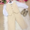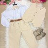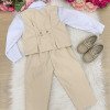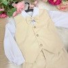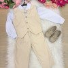 Conjunto Social Infantil Colete Elegante, clássico e atemporal, esse conjunto é perfeito para ocasiões especiais como casamentos, batizados, aniversários e eventos formais. Tecidos Camisa: Microfibra 100% poliéster – leve, confortável e com excelente caimento. Colete e calça: Sarja 100% poliéster – estruturada, resistente e sofisticada. O conjunto é composto por: Camisa social branca de manga longa Gravata borboleta bege Colete bege com fechamento frontal por botões Calça bege com corte social A combinação de tons neutros traz sofisticação e versatilidade, criando um visual clássico que nunca sai de moda. O colete adiciona um toque refinado, enquanto a calça social completa o look com elegância. Ideal para quem busca um visual alinhado, confortável e cheio de presença. Informações Importantes Demais peças e acessórios da foto não estão inclusos. Calçados vendidos separadamente. Pode haver variação de tonalidade do produto conforme a configuração da tela do seu dispositivo.