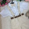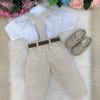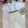 Este conjunto social infantil é a escolha perfeita para deixar os pequenos elegantes e confortáveis em eventos como casamentos, batizados, aniversários, formaturas e cerimônias em geral. Com um visual sofisticado, ele é ideal para quem busca estilo com praticidade. Detalhes do Produto: Camisa social branca manga curta, confeccionada em microfibra 100% poliéster, com toque macio, caimento leve, clássica e confortável Calça linho confeccionada em 70% poliester, 16% viscose, 11% linho, 3% algodão, com corte reto e caimento sofisticado. Acompanha gravata borboleta linho, suspensório linho com regulagem e cinto ajustável marrom com fivela metálica. Itens Inclusos:Camisa SocialCalçaGravata borboletaSuspensórioCinto Calçado não incluso – vendido separadamente. Disponivel em nosso site na categoria calçados meninosAs tonalidades das peças podem variar de acordo com as configurações de tela do seu dispositivo.Para garantir o ajuste ideal, consulte sempre a nossa tabela de medidas antes de finalizar a compra. As medidas podem apresentar 2cm de variações conforme o lote de fabricação.