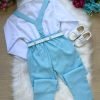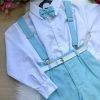 Conjunto composto por: Camisa Social na cor Branca, Gravata Borboleta na cor Azul Bebe, Cinto na Cor Branca ,Suspensório e Calça na cor Azul Bebe