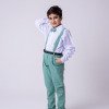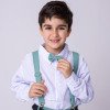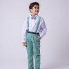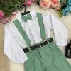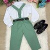 TECIDO CAMISA SOCIAL MANGA LONGA : MICROFIBRA 100%TECIDO DA CALÇA: 70% POLIESTER, 16% VISCOSE, 11% LINHO,3%ALGODÃO Conjunto composto por: Camisa Social na cor Branca, Gravata Borboleta na cor verde, Cinto na Cor preto,Suspensório e Calça na cor verde. Demais peças ou acessórios, não inclusos. BATIZADO,PAGEM,NOIVINHO