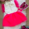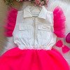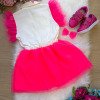 Confeccionado em tecido misto SARJA  proporcionando um caimento incrível e sofisticado, possui gola redonda, comprimento médio, mangas curtas,completa o look dos sonhos!   ROSA NEON, BABADO, BABADINHOS, BLOGUEIRINHA.   ACOMPANHA LAÇO DE CABELO.    * Medidas podem variar em até 4cm * Caso queira o vestido mais armado, recomendamos o uso do saiote ou anágua de armação, disponível no nosso site na categoria acessórios. * Tiara vendida separadamente, disponível em nosso site na categoria acessórios. * Calçados vendido separadamente, disponível em nosso site na categoria calçados. * LEMBRANDO QUE PODERA HAVER VARIAÇÃO DE TONALIDADE DO PRODUTO DEPENDENDO DA TELA DO SEU DISPOSITIVO
