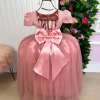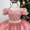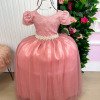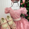 Encanto e sofisticação em cada detalhe!  Esse vestido rose é puro charme, perfeito para transformar qualquer ocasião em um verdadeiro conto de fadas. Detalhes do modelo: Corpo em cetim com delicados bordados florais sobre a renda que trazem elegância; Mangas estruturadas, super modernas e românticas; Cintura marcada com cinto de pérolas, garantindo um acabamento sofisticado; Saia longa com sobreposição de tule leve e fluido, criando movimento e volume encantador; A renda pode variar de acordo com o corte no busto; Tecido Cetim 100% poliester/ Tafeta 100% poliester/ tule 100% poliester/ forro 100% poliester Onde usar:Ideal para festas de aniversário, casamentos, formaturas, ensaios fotográficos e ocasiões especiais onde sua princesa precisa brilhar. Esse modelo é pura delicadeza e luxo, trazendo o equilíbrio perfeito entre conforto e glamour.   Informações Importantes As medidas podem variar em até 3cm. Recomendamos sempre consultar a tabela de medidas antes da compra para evitar erros. Para um volume extra, indicamos o uso de saiote de armação, vendido separadamente na categoria Acessórios. Tiara e outros acessórios não acompanham o produto, mas estão disponíveis em nosso site. Calçado vendido separadamente, disponível na categoria Calçados. As cores do produto podem sofrer variações de tonalidade conforme a configuração da tela do seu dispositivo.