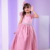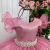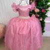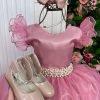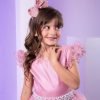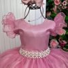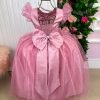 Confeccionado em tecido misto possui forro em poliéster e algodão para não incomodar a criança e proporcionando um caimento incrível e sofisticado, possui gola redonda,renda de flores e apliques de strass no peito, comprimento médio, mangas curtas, possui elástico nas costas para melhor ajuste, acabamento com lindo laço na parte posterior do vestido completa o look dos sonhos!