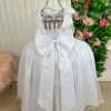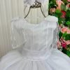 Confeccionado em tecido misto possui forro em poliéster e algodão para não incomodar a criança e proporcionando um caimento incrível e sofisticado, possui gola redonda,renda de flores e apliques de strass no peito, comprimento médio, mangas curtas, possui elástico nas costas para melhor ajuste, acabamento com lindo laço na parte posterior do vestido completa o look dos sonhos!