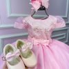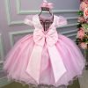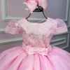 Confeccionado em tecido misto possui forro em poliéster e algodão para não incomodar a criança e proporcionando um caimento incrível e sofisticado, possui gola redonda, comprimento médio, mangas curtas, possui elástico nas costas para melhor ajuste, acabamento com lindo laço na parte posterior do vestido completa o look dos sonhos!