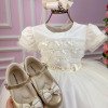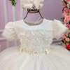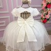 Confeccionado em tecido misto possui forro em poliéster e algodão para não incomodar a criança e proporcionando um caimento incrível e sofisticado, possui gola redonda,renda de flores e apliques de strass no peito, comprimento médio, mangas curtas, possui elástico nas costas para melhor ajuste, acabamento com lindo laço na parte posterior do vestido completa o look dos sonhos!