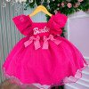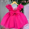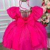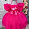 Confeccionado em tecido misto possui forro em poliéster e algodão para não incomodar a criança e proporcionando um caimento incrível e sofisticado, possui gola redonda, comprimento médio, mangas curtas de tule, possui elástico nas costas para melhor ajuste, acabamento com lindo laço na parte posterior do vestido completa o look dos sonhos!