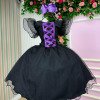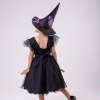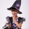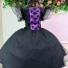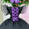 Apresentamos a fantasia Bruxinha Encantada, um modelo temático de Halloween cheio de charme e magia para as pequenas arrasarem nas festas!  O vestido é confeccionado em tecido preto com detalhes em tule com glitter, que garantem brilho delicado e sofisticado. O busto traz acabamento com fita lilás em estilo corset, enquanto as mangas curtas bufantes em tule transparente adicionam volume e leveza. A saia midi em camadas de tule oferece movimento gracioso, perfeito para dar aquele ar encantado ao visual. O chapéu de bruxa estruturado, com aplicação de detalhe lilás em formato de teia de aranha, completando o look e garantindo a caracterização perfeita. Disponivel em nosso site na categoria acéssorios Detalhes importantes: Modelo temático de Halloween; Vestido em tule com glitter e detalhe corset lilás; Manga bufante transparente; Ideal para festas de Halloween, ensaios temáticos e apresentações escolares.   Esse é o look que une delicadeza e diversão, tornando qualquer bruxinha a estrela da festa!   Informações Importantes As medidas podem variar em até 2cm. Recomendamos sempre consultar a tabela de medidas antes da compra para evitar erros. Para um volume extra, indicamos o uso de saiote de armação, vendido separadamente na categoria Acessórios. Tiara e outros acessórios não acompanham o produto, mas estão disponíveis em nosso site. Calçado vendido separadamente, disponível na categoria Calçados. As cores do produto podem sofrer variações de tonalidade conforme a configuração da tela do seu dispositivo.